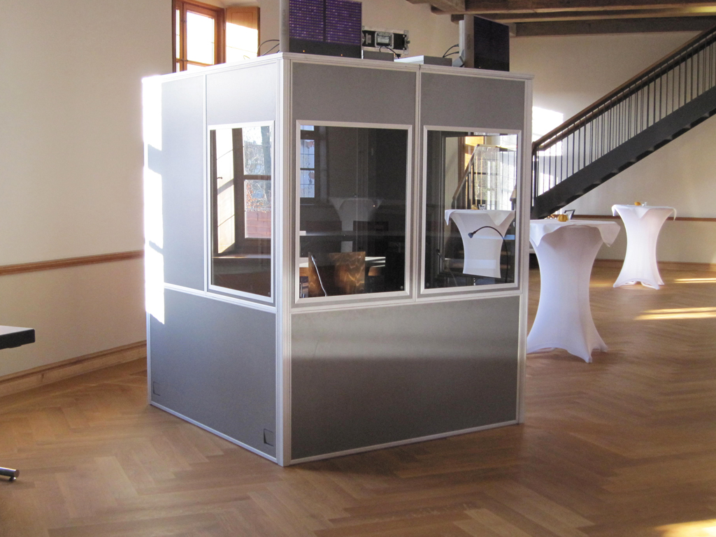 - Simultandolmetschtechnik mit Dolmetscherkabine und Übertragung in zwei Sprachen